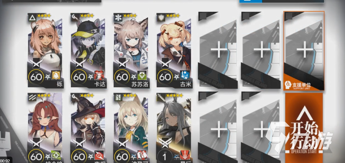 首先在左下角放置桃金娘,在中央位置放置波登可,在其左側(cè)放置夜煙,在夜煙身后放置卡達,在夜煙上方放置古米,在波登可的右側(cè)兩格放置蘇蘇洛,史爾特爾放置在桃金娘右側(cè)三格,最后放置史努爾特和礫,用來對付最后的怪物。