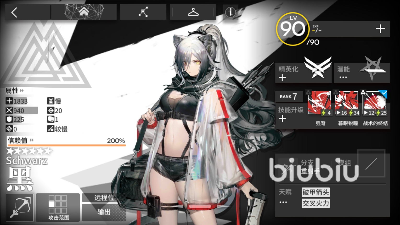 上面兩個(gè)干員都屬于速狙干員,下面要推薦的則是特化狙擊干員。首先是破甲狙擊:黑,黑的天賦可以造成敵人護(hù)甲損失,而她的三技能戰(zhàn)術(shù)的終結(jié)更是游戲中最強(qiáng)的破甲輸出技能,有著開(kāi)罐器的美稱(chēng)。即便是面對(duì)愛(ài)國(guó)者這樣的超高護(hù)甲BOSS也能夠做到一輪戰(zhàn)術(shù)的終結(jié)帶走敵人,非常恐怖。