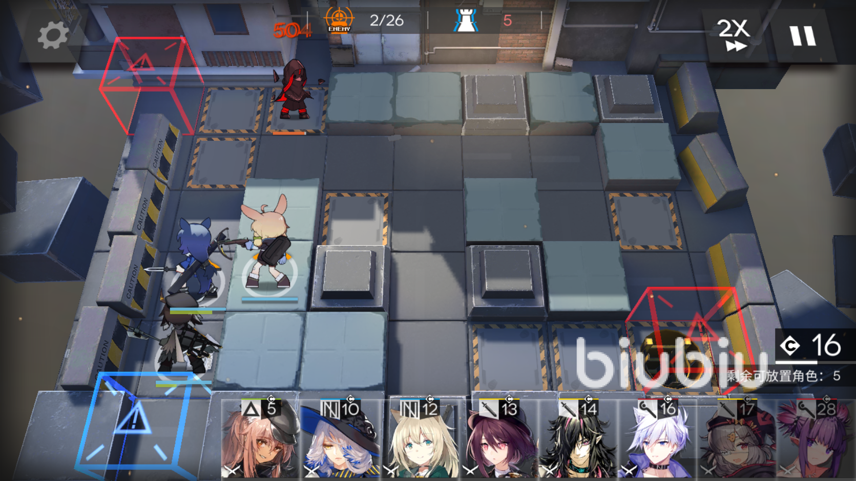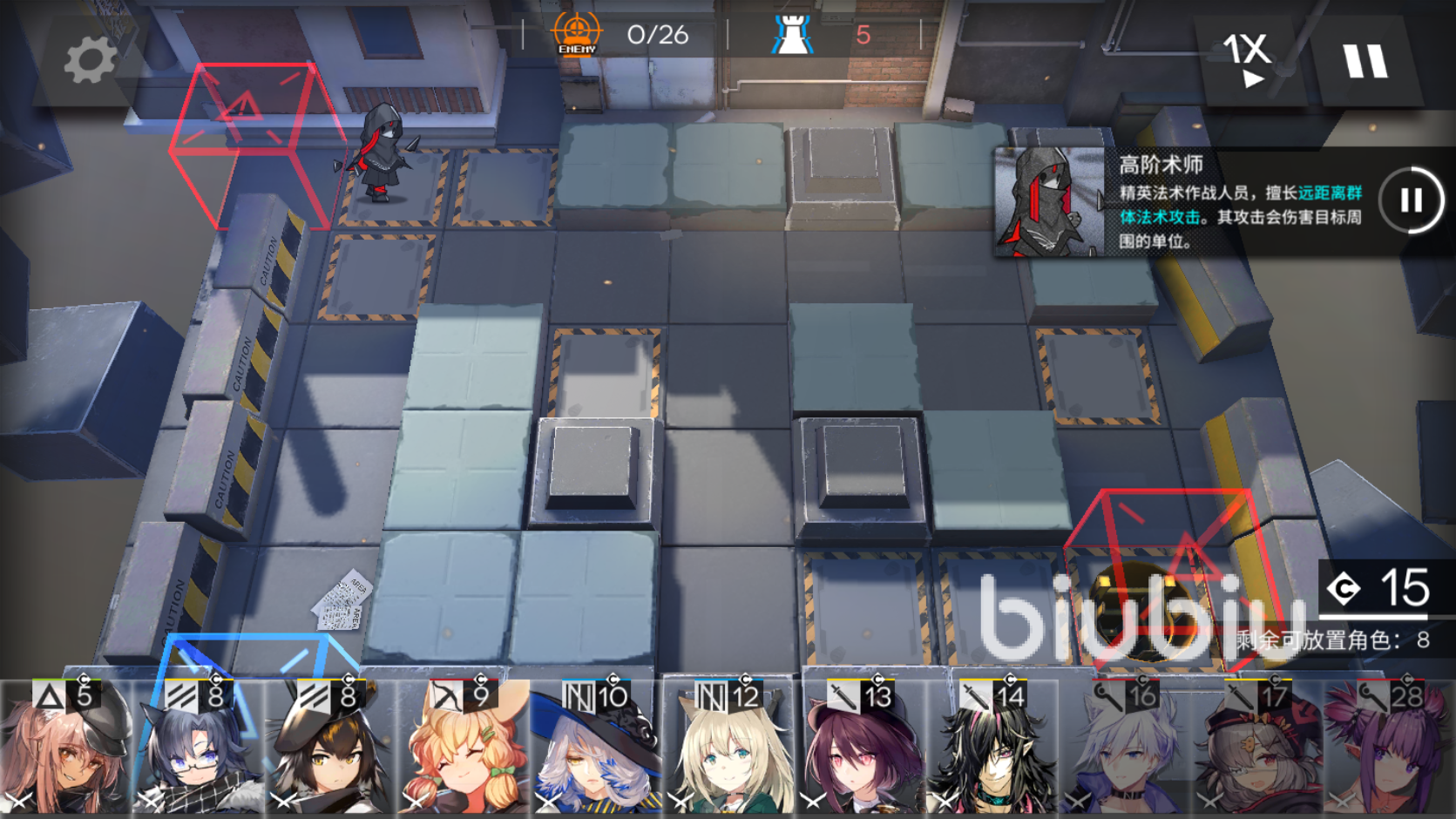 進(jìn)入到關(guān)卡后我們可以看到,2-4只需要防守一個(gè)藍(lán)色目標(biāo)點(diǎn),因此我們需要在目標(biāo)點(diǎn)前部署干員防守。不過,開局就出現(xiàn)的高階術(shù)士對(duì)于密集的干員們來說是個(gè)不小的麻煩,而高階術(shù)士的弱點(diǎn)在于:他在開局后會(huì)掛機(jī)一分鐘,這一分鐘內(nèi)只要沒有目標(biāo)出現(xiàn)在他的攻擊范圍內(nèi),高階術(shù)士就不會(huì)主動(dòng)移動(dòng)并發(fā)起攻擊。因此我們需要趁這個(gè)機(jī)會(huì)部署雙先鋒進(jìn)行費(fèi)用回復(fù)。