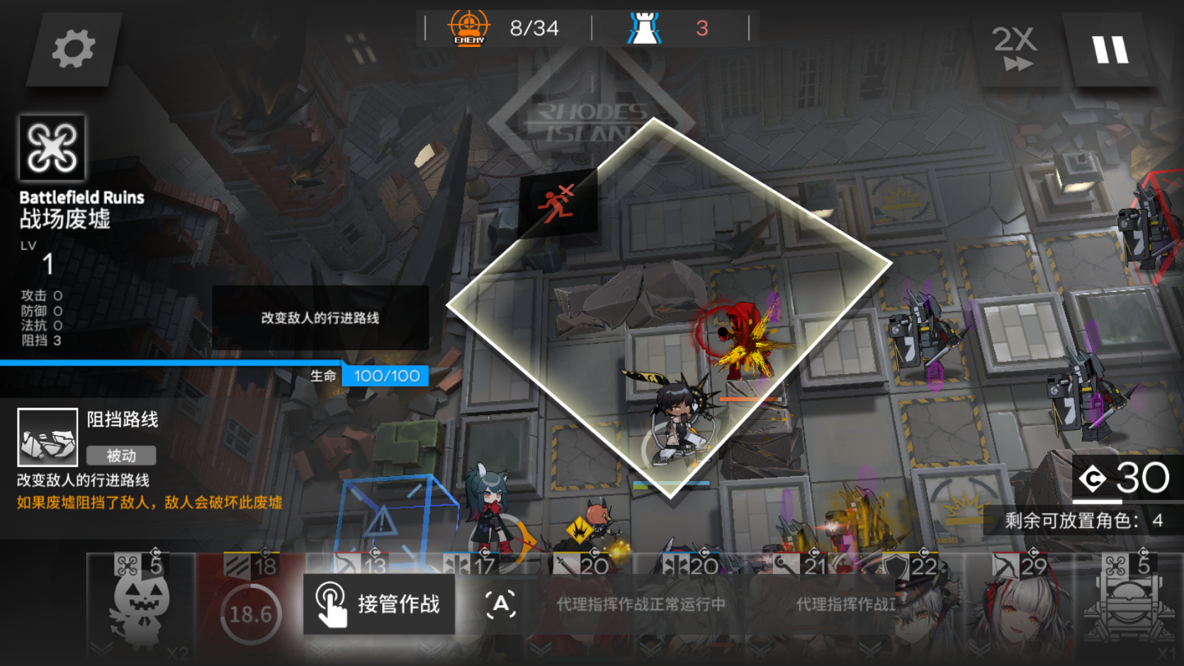 為了盡可能地提升通關(guān)速度,大家最好選擇風(fēng)笛加桃金娘的風(fēng)桃體系,實現(xiàn)開局快速回費。進入到關(guān)卡后可以看到,開局我方目標(biāo)點前有一個敵方術(shù)士會攻擊我方高挑,如果是風(fēng)桃體系的話費用就不會緊張,可以直接空降干員將他切掉。接著使用爆破裝置,將地圖正上方的破碎支柱向左擊倒,避免敵人分流。注意這里一定要向左擊倒,否則形成的戰(zhàn)場廢墟是無效的。