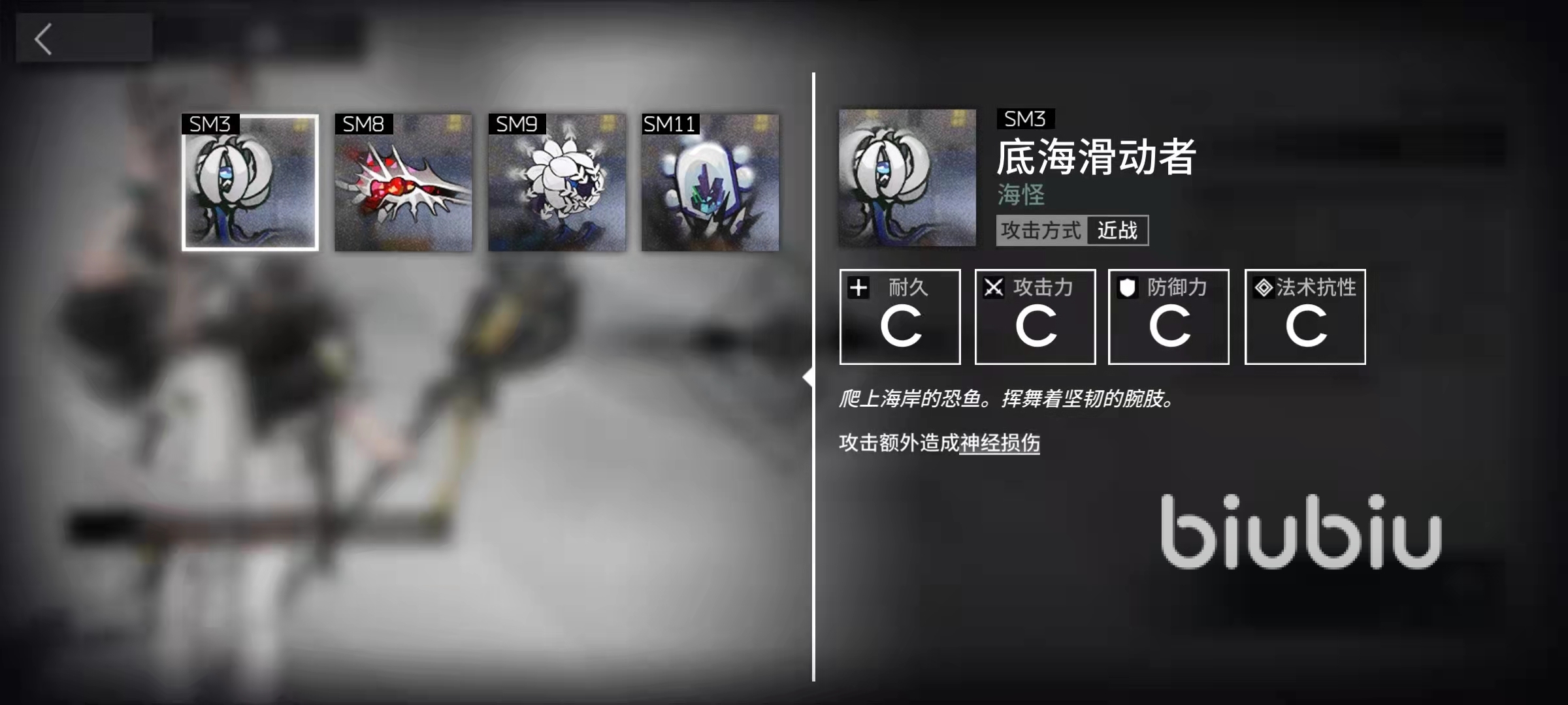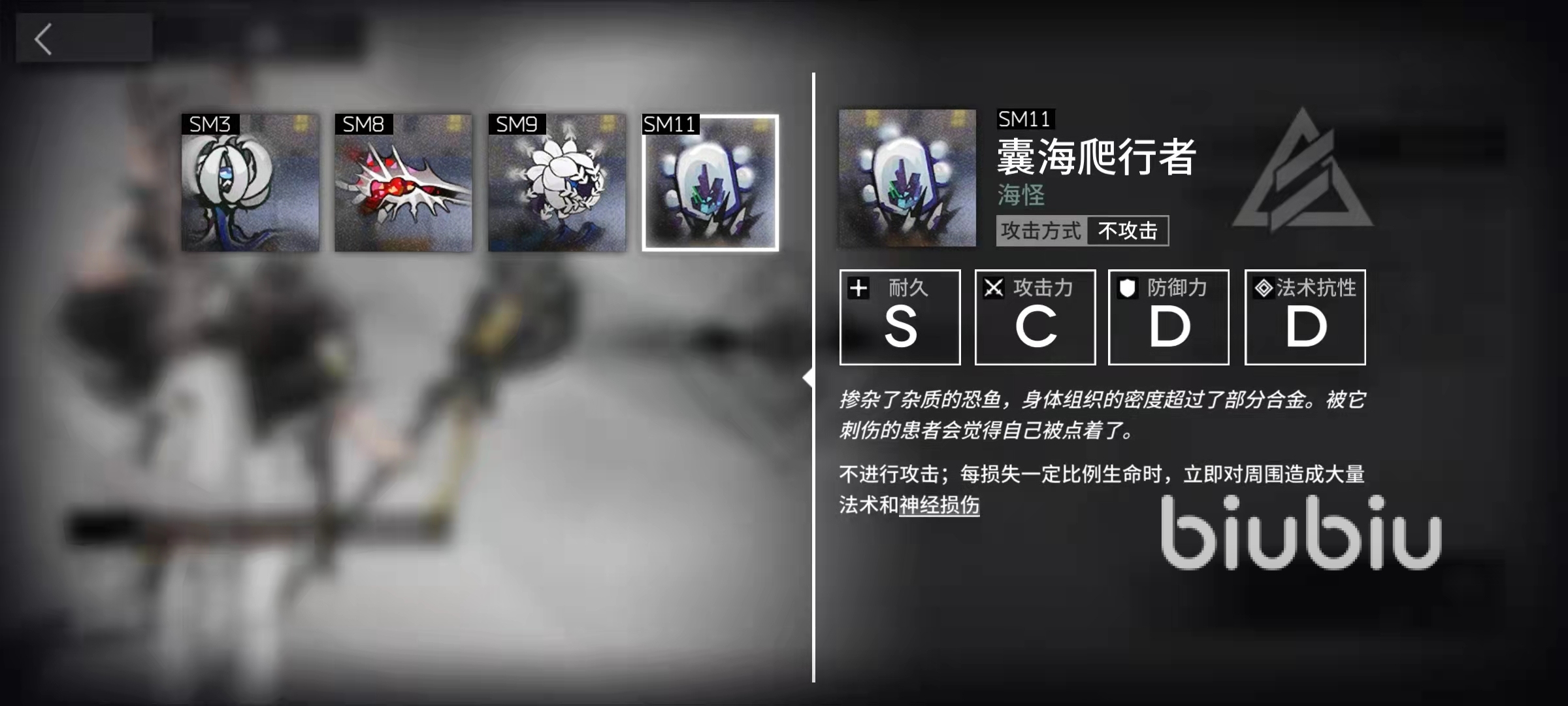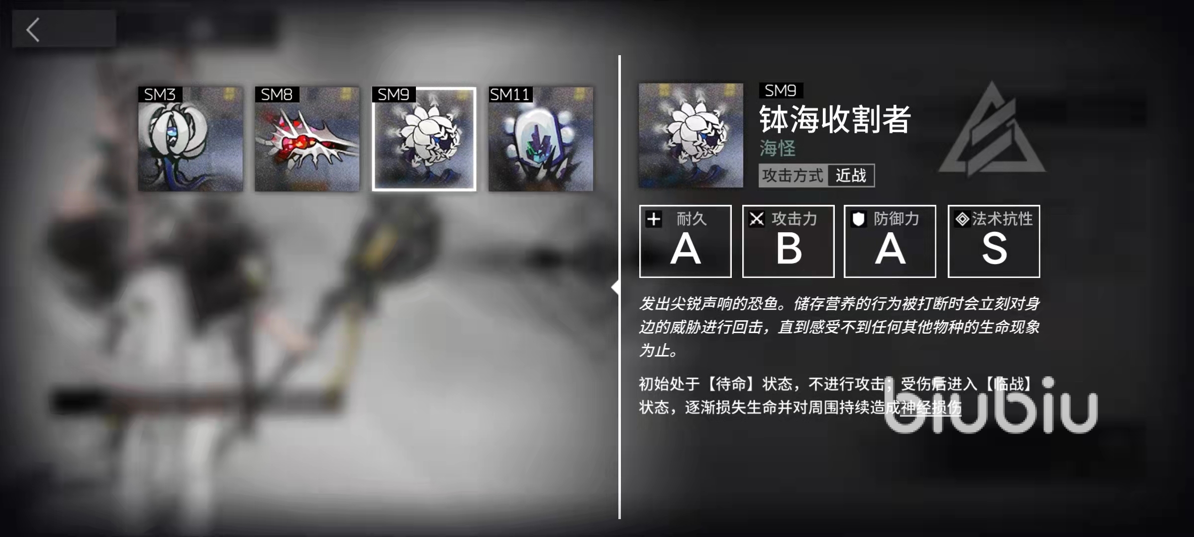 缽海收割者,它們的攻擊力也不算高,防御力和法術(shù)抗性還有耐久度較為優(yōu)秀,它們是很難處理的敵人,因為它們被攻擊之后會進入臨戰(zhàn)狀態(tài),移動速度會大幅提高,臨戰(zhàn)狀態(tài)下還會持續(xù)對周圍的我方單位造成精神損傷,是一種很不好解決的敵人。
