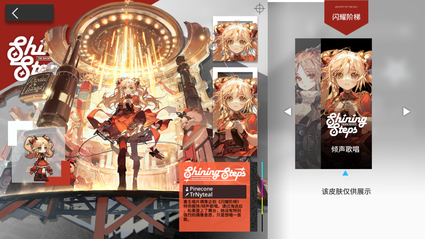 明日方舟中干員松果是監(jiān)獄風云活動中上線的四星散射狙擊干員,也是該職業(yè)模組的首個干員,有著非常獨特的收藏意義,實戰(zhàn)價值也很不錯。作為松果的第一個皮膚,“傾聲歌唱”不管是皮膚的價值還是外觀都非常的不錯,雖然作為四星皮膚沒有技能特效,但是該皮膚還有一個獨到的優(yōu)勢,那就是“傾聲歌唱”是可以免費獲得的,完全不需要花費任何源石。