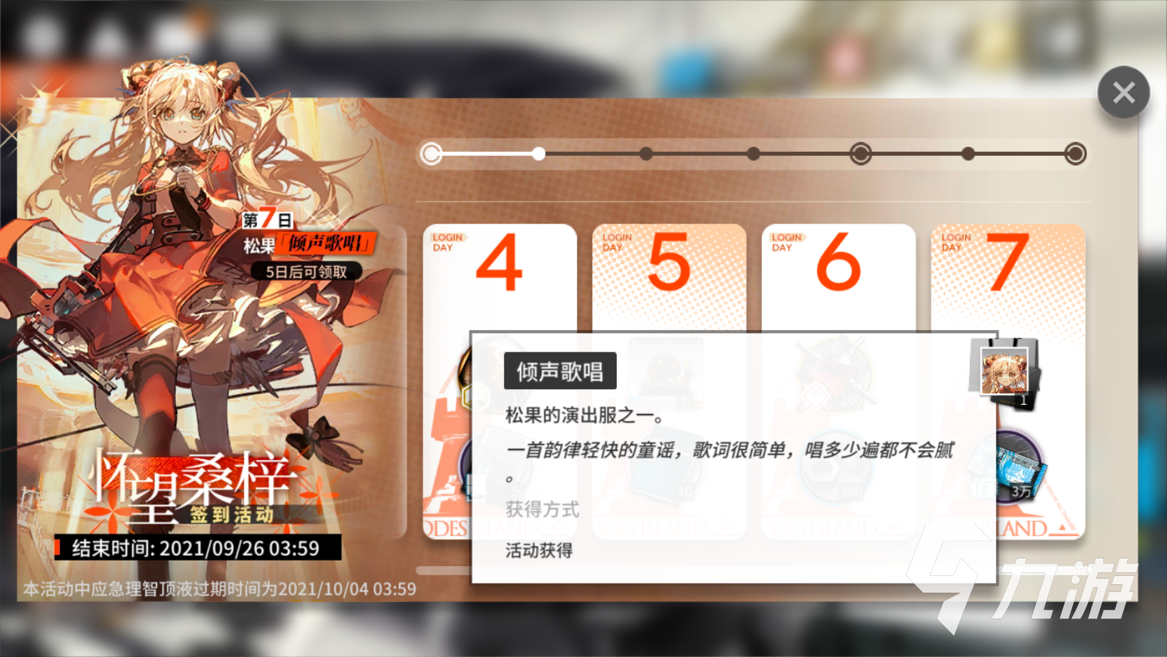 在明日方舟新主線風暴瞭望活動的持續(xù)期間,玩家可以通過參與游戲中的簽到活動“懷望桑梓”來領取松果的傾聲歌唱皮膚。該皮膚需要玩家累計簽到7天才可以獲得,而懷望桑梓簽到活動的總持續(xù)時間是14天,并且由于是累計而不是連續(xù),因此大家中間漏簽幾次也是沒有問題的。