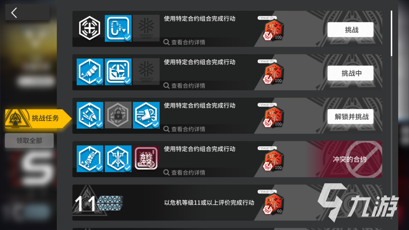 首先小編建議大家先將所有的特定合約挑戰(zhàn)任務(wù)完成,這是因?yàn)槲覀兿胍瓿?8級(jí)的累計(jì)合約挑戰(zhàn)任務(wù)的話,就必須獲得名為“行動(dòng)協(xié)議”的道具。而行動(dòng)協(xié)議就需要大家挑戰(zhàn)特定合約任務(wù)才可以得到,從上圖中我們可以看到,不同的特定合約挑戰(zhàn)任務(wù)之間可能會(huì)出現(xiàn)沖突的情況。為了盡可能地節(jié)省挑戰(zhàn)次數(shù),大家可以將不沖突的合約挑戰(zhàn)任務(wù)放在一起完成。