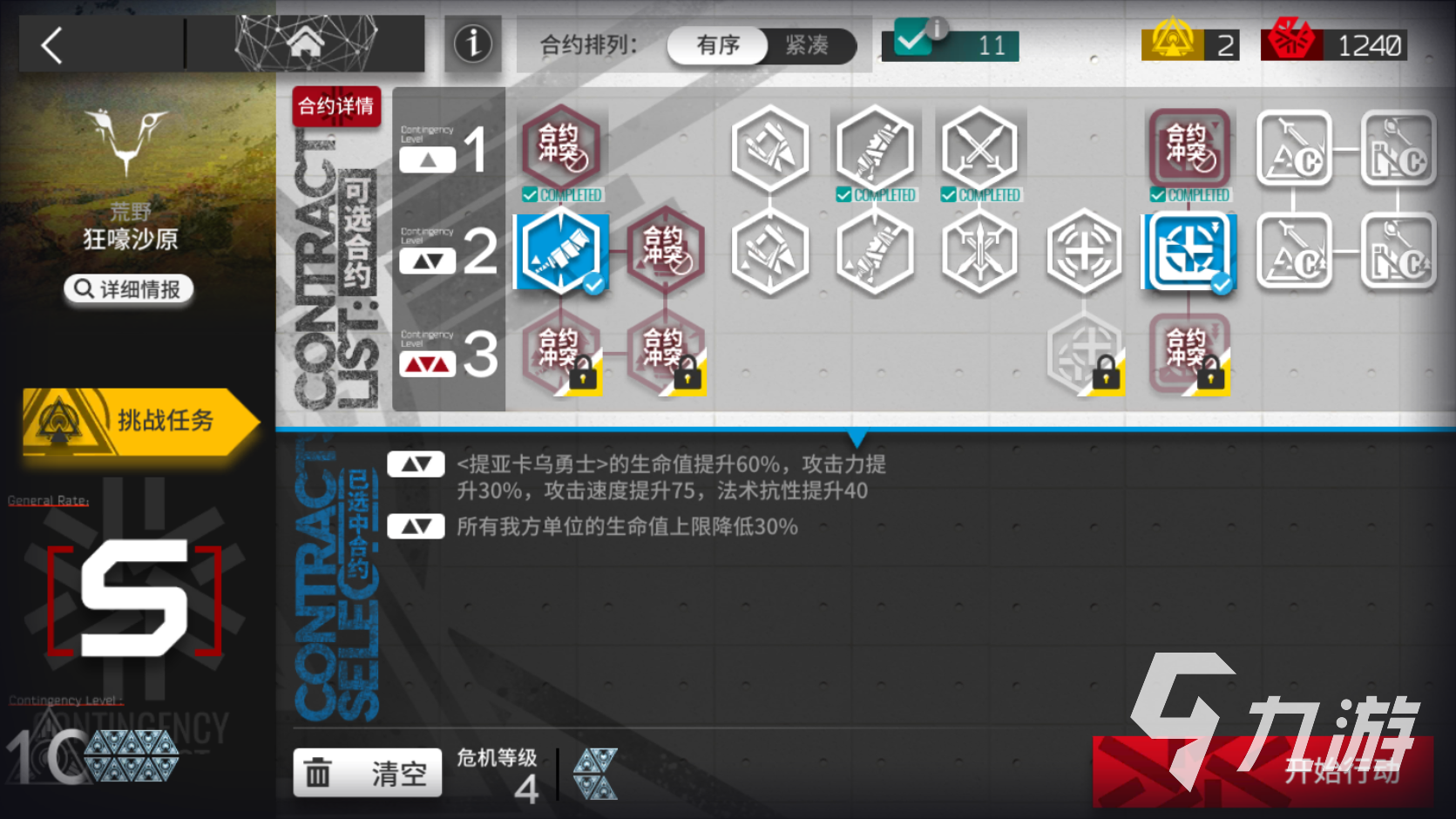 大家可以直接點(diǎn)擊右邊的挑戰(zhàn)選項(xiàng),系統(tǒng)就會(huì)直接為我們選中對(duì)應(yīng)的合約,點(diǎn)擊多個(gè)挑戰(zhàn)即可將不同的合約疊加在一塊,大家就可以一起完成了。當(dāng)然采用這種方法的話通關(guān)難度會(huì)比較大,低練度的玩家還是一個(gè)一個(gè)做比較穩(wěn)妥。
