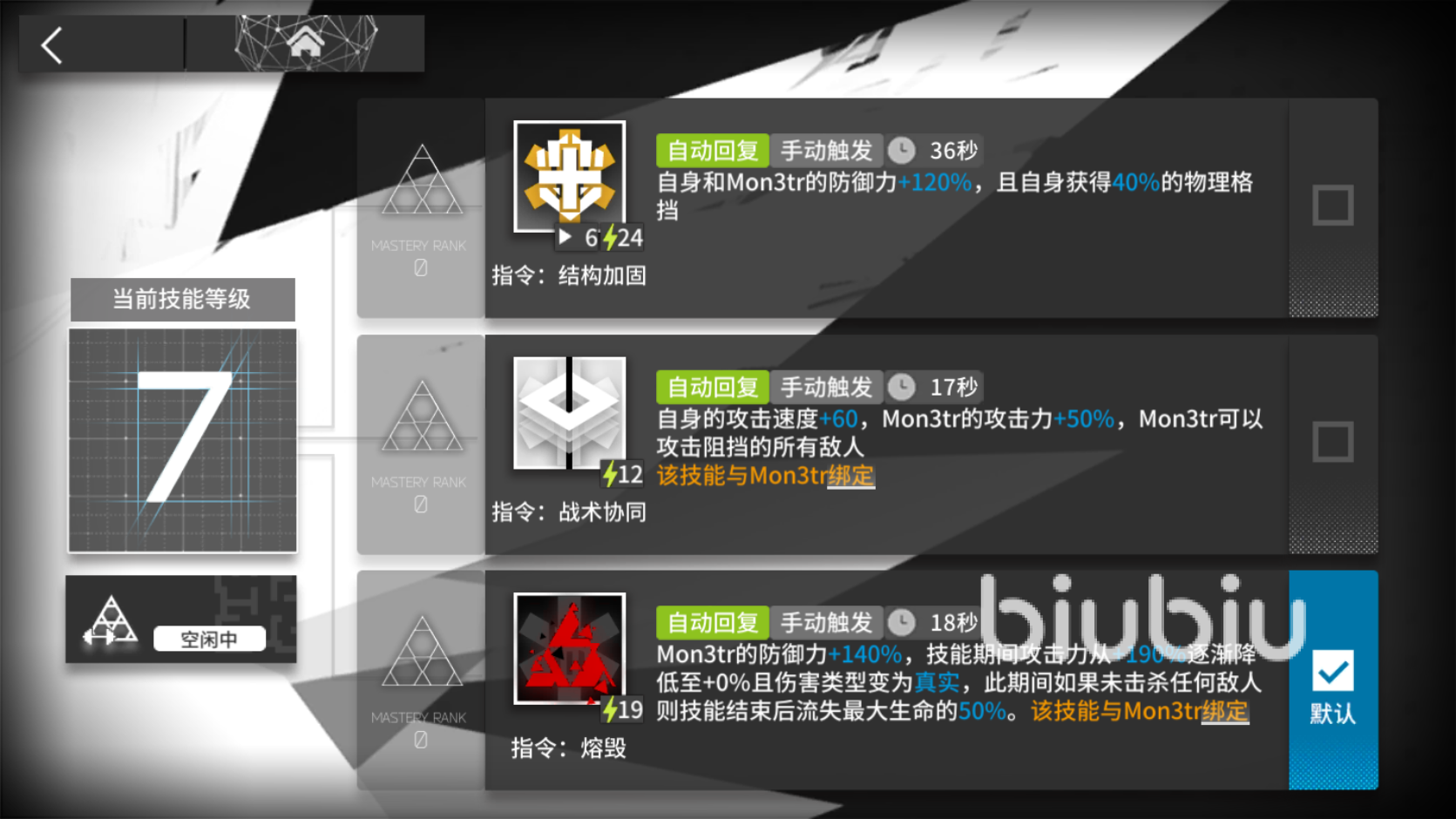 凱爾希的三個(gè)技能也是緊緊圍繞著Mon3tr展開,1技能在開啟后,凱爾希和召喚的防御力會(huì)大幅度提高,且凱爾希本身獲得一定的物理抵抗。該技能的實(shí)戰(zhàn)作用在于使凱爾希成為“高臺(tái)重裝”,幫助其他高臺(tái)干員抵擋傷害。2技能則是常態(tài)使用技能,可以提高M(jìn)on3tr的攻擊力并使其攻擊抵擋的所有敵人,在一些高壓圖中發(fā)揮出色。