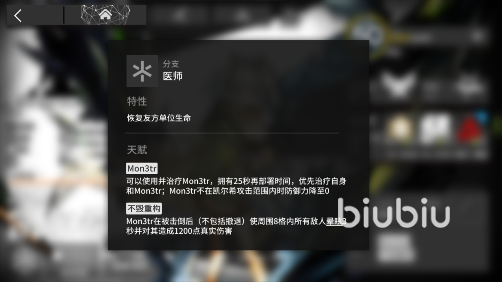 凱爾希是明日方舟游戲中最為特殊的醫(yī)療干員,她有著極遠(yuǎn)的治療距離,但是其天賦使得她會(huì)優(yōu)先治療自己以及召喚物Mon3tr,再加上她本身的攻擊力并不出色。因此實(shí)戰(zhàn)中凱爾希的奶量并不高,可以說其主要的能力就是其召喚物Mon3tr。但相對(duì)的,召喚物Mon3tr可以說是目前游戲中最強(qiáng)的召喚生物。Mon3tr的基礎(chǔ)面板非常高,它有著1200的攻擊力,400的防御以及高達(dá)5400的血量,強(qiáng)度碾壓大部分干員。