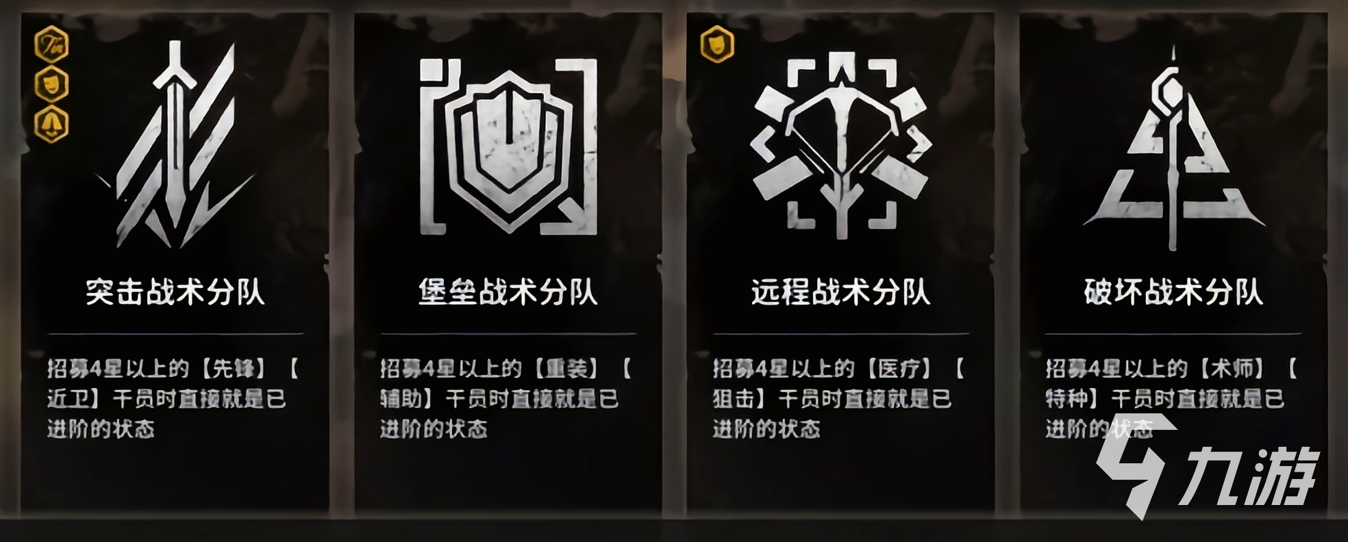 突擊戰(zhàn)術(shù)分隊(duì)最簡單;堡壘戰(zhàn)術(shù)分隊(duì)適合狙擊隊(duì)和凱希玩家;堡壘戰(zhàn)術(shù)分隊(duì)無輸出慎選;破壞分隊(duì)適合專精玩家;最后倆分隊(duì)純純看臉,非酋玩家勿選。