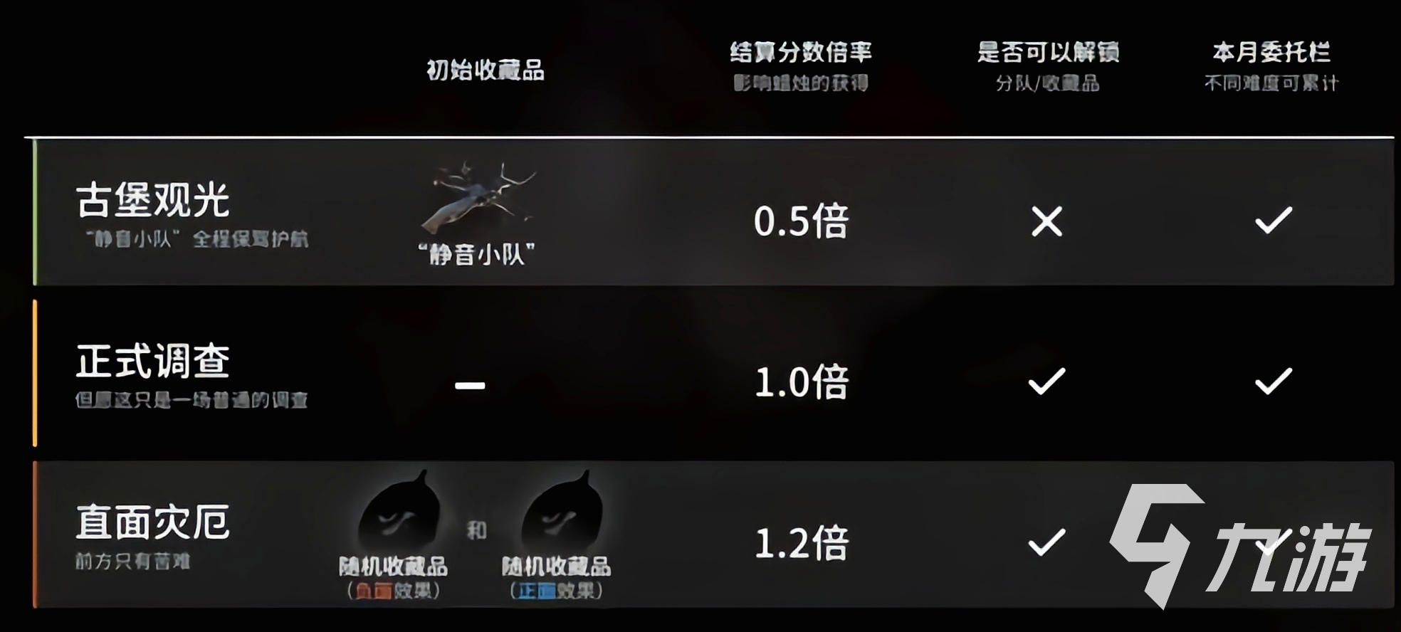 三種模式難度逐級遞加,其中古堡觀光的用處是用來熟悉地圖,來了解大小關(guān)卡間的變化形式,在游玩后會(huì)給予靜音小隊(duì)收藏品,但是通關(guān)和失敗都不會(huì)解鎖收藏品,而且蠟燭獲取效率為0.5倍但此關(guān)卡會(huì)給你通關(guān)標(biāo)識(shí);正式調(diào)查難度適中且能解鎖收藏品,是大部分人會(huì)選擇的游玩模式,最后介紹的直面災(zāi)厄模式屬于氪佬和大佬的模式,一般的平民玩家不推薦游玩,因?yàn)殡y度過高,此關(guān)卡僅適合打挑戰(zhàn)玩家(如合約高難)進(jìn)行體驗(yàn)游玩,且此關(guān)卡在開局時(shí)會(huì)獲得一個(gè)負(fù)面收藏品(目前最簡單的負(fù)面收藏品是酒神的印記)。