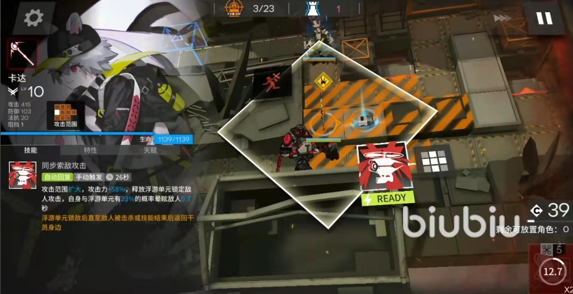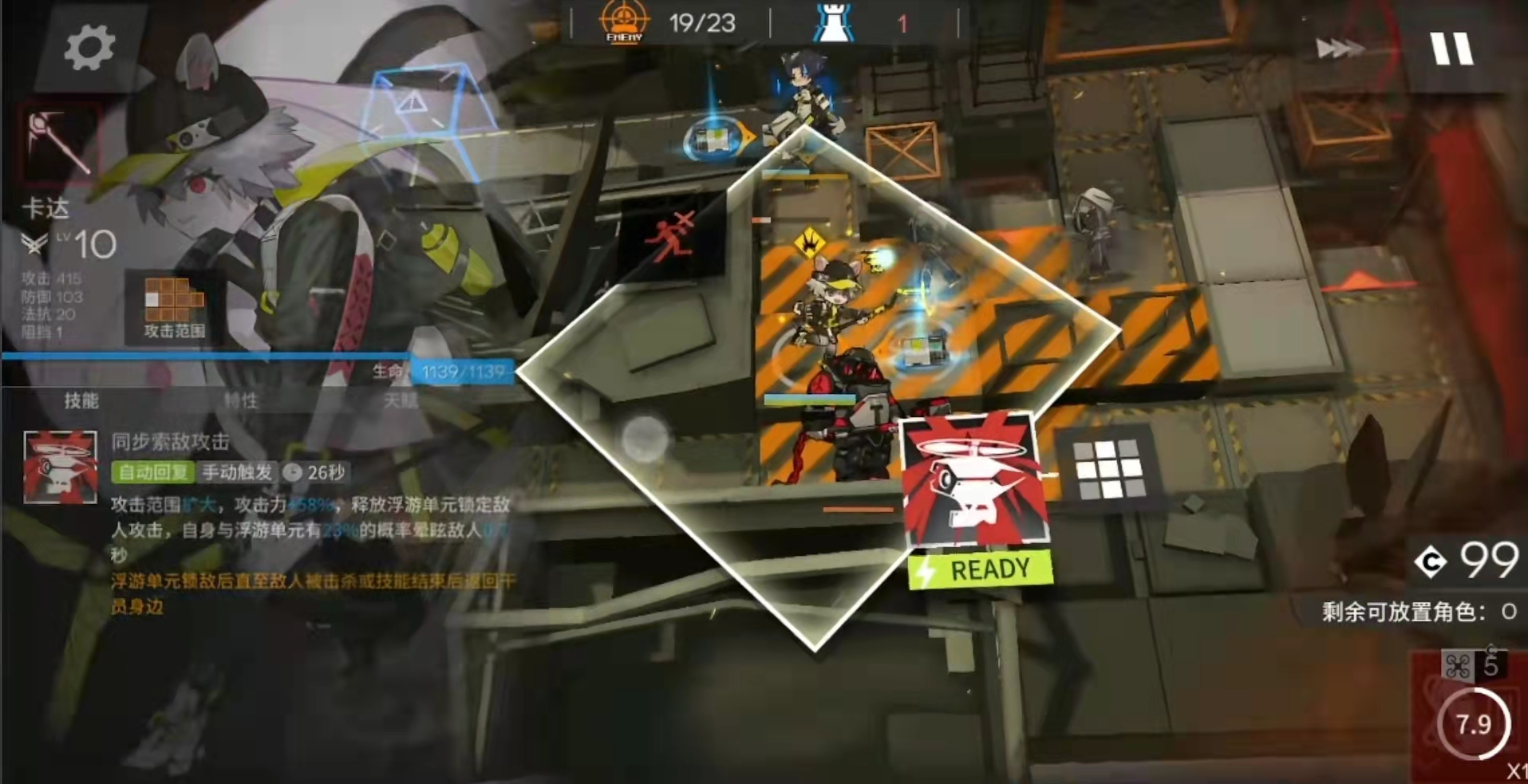 進(jìn)入地圖后,將掠風(fēng)放在圖示位置,卡達(dá)是系統(tǒng)已經(jīng)部署好的了,在這關(guān)中出現(xiàn)的兩種敵人,一種是粉碎攻堅(jiān)組長(zhǎng),還有一種就是潛伏者了,粉碎攻堅(jiān)組長(zhǎng)從下路往上走,他護(hù)甲較高,攻擊力也不俗,因此主要交給卡達(dá)解決,潛伏者有隱匿效果,在阻擋前無(wú)法被發(fā)現(xiàn),因此卡達(dá)無(wú)法攻擊到他們,這部分?jǐn)橙俗匀痪褪锹语L(fēng)的工作了。
