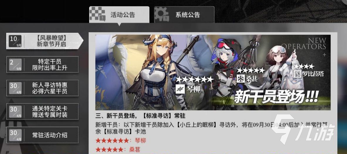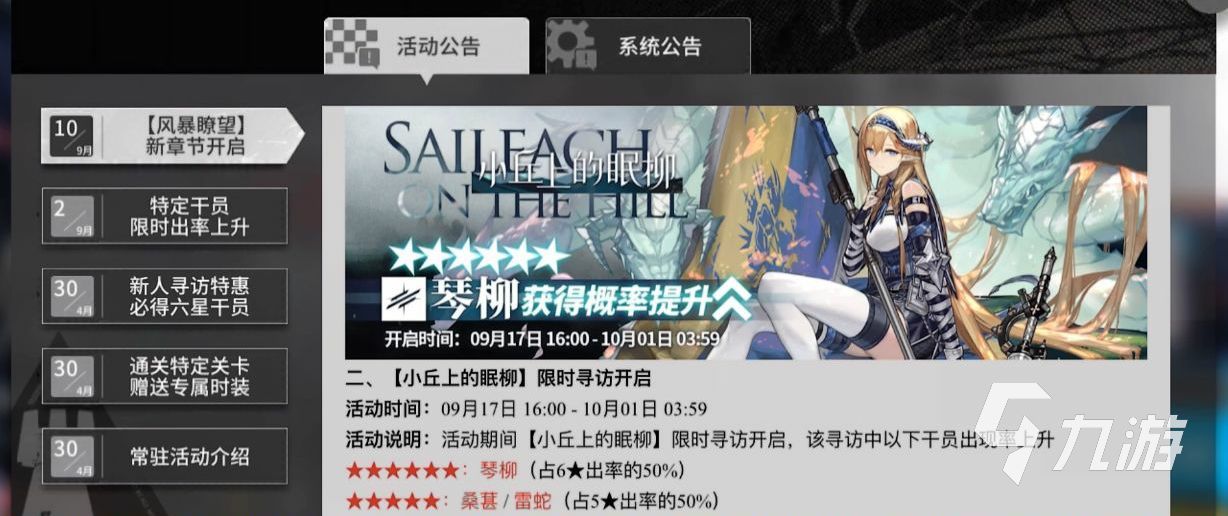 第一個就是開啟小丘上的眠柳,在這個現實尋訪活動中,玩家們抽到六星角色琴柳的概率達到了50%,五星干員桑葚的概率達到了50%,四星卡池中羅比拉塔的概率達到20%,但是僅僅在標準尋訪活動中才會有這種加成,豪華尋訪以及特殊尋訪都不會有這種概率提升。