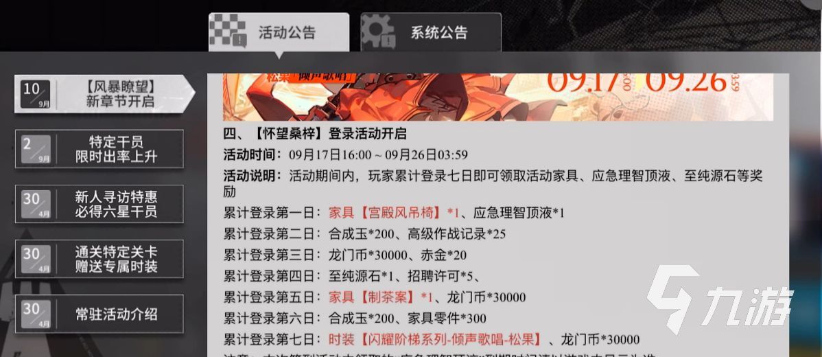 第二個伴隨著第九章節(jié)的活動就是懷望桑梓,在這個登錄活動中,玩家們只要累計登錄七天就可以獲取家具,原石,以及尋訪憑證等大量獎勵,第一天獲取家具以及應急理智頂液,第二天獲得合成玉和高級作戰(zhàn)記錄,第三天獲取龍門幣以及赤金,第四天獲得至純原石以及招聘許可證,第五天獲得制茶案家具以及龍門幣,第六天可以獲得合成玉以及家具零件,第七天獲得閃耀階梯時裝以及龍門幣。