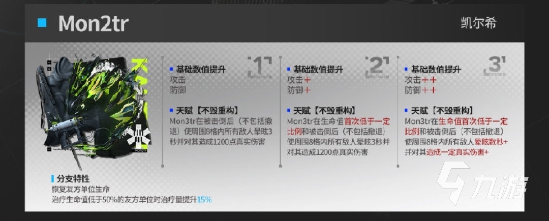 在提升模組等級(jí)之后,凱爾希的基礎(chǔ)數(shù)值也會(huì)得到提升,攻擊力提升能夠增強(qiáng)提高治療量,防御力提升增強(qiáng)了生存能力,提升模組等級(jí)到二級(jí)后,不毀重構(gòu)的效果會(huì)得到增強(qiáng),Mon3tr在當(dāng)前部署時(shí)生命值首次低于一定比例會(huì)額外觸發(fā)一次不毀重構(gòu),這一加強(qiáng)無(wú)疑增強(qiáng)了它的功能性,在某些場(chǎng)合有不錯(cuò)的作用。