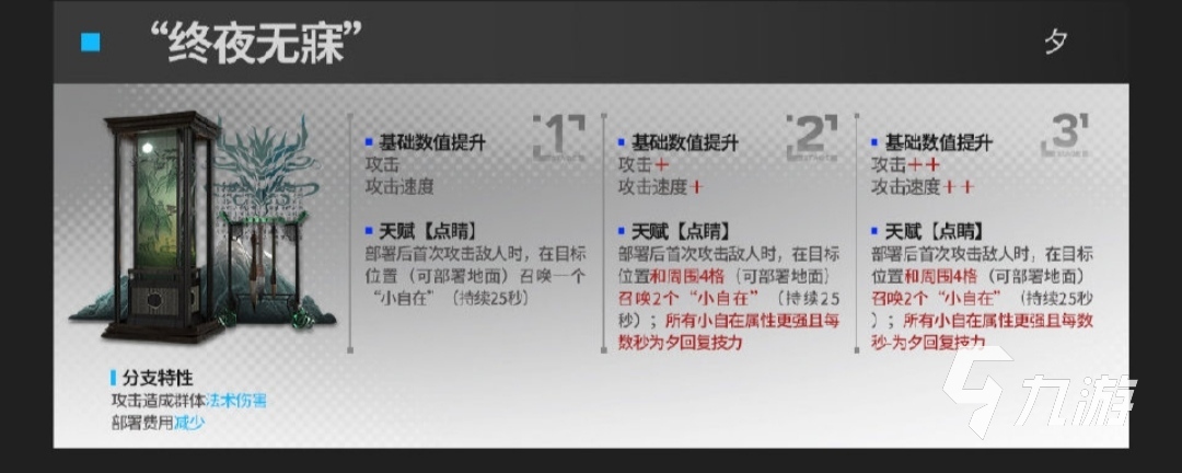 最后一個(gè)值得開啟的模組是夕的模組“終夜無(wú)寐”,這個(gè)模組分支特性更新的和莫斯提馬的第一模組相似,都是減少部署費(fèi)用,增加攻擊力,因此特性的增強(qiáng)沒有什么值得關(guān)注的,需要關(guān)注的是夕天賦的改變。
