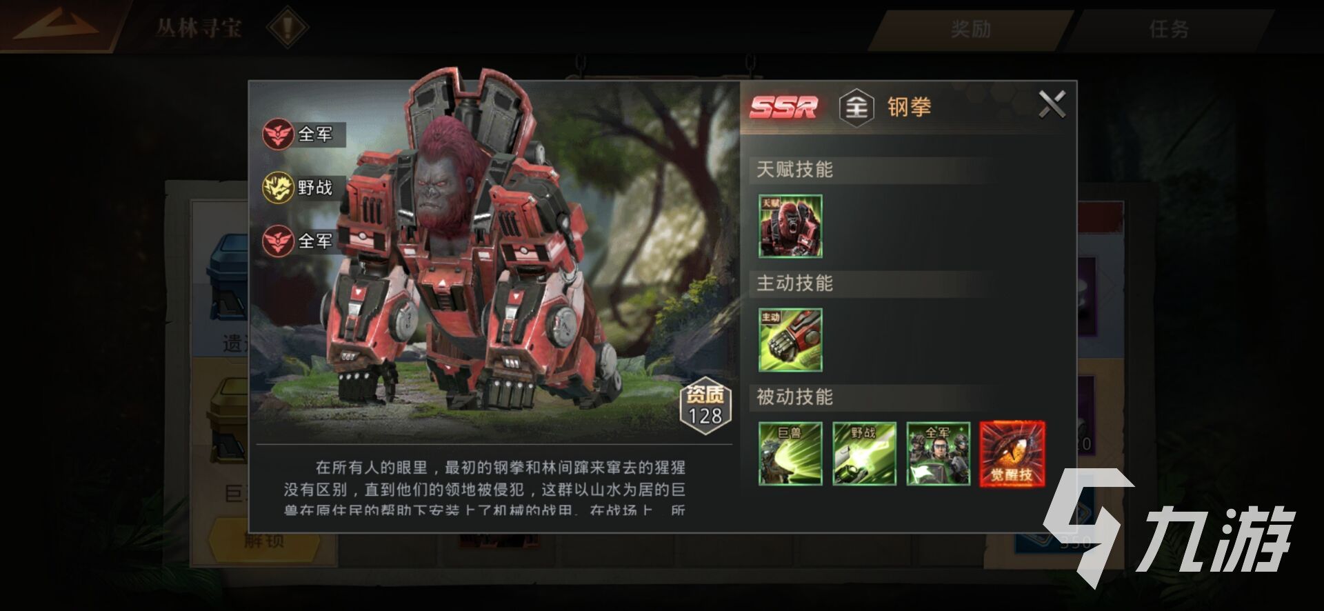 叢林尋寶根據(jù)小伙伴們是普通尋寶還是特級(jí)尋寶,分為兩種模式,小伙伴們需要充錢才能夠達(dá)到巨牙秘寶,在巨牙秘寶中,小伙伴們是可以獲得鋼拳這個(gè)ssr等級(jí)的巨獸的,剛?cè)@個(gè)巨獸對(duì)于小伙伴們來說,在前期的戰(zhàn)斗中是非常強(qiáng)力的存在,他有著非常大的范圍性AOE技能。