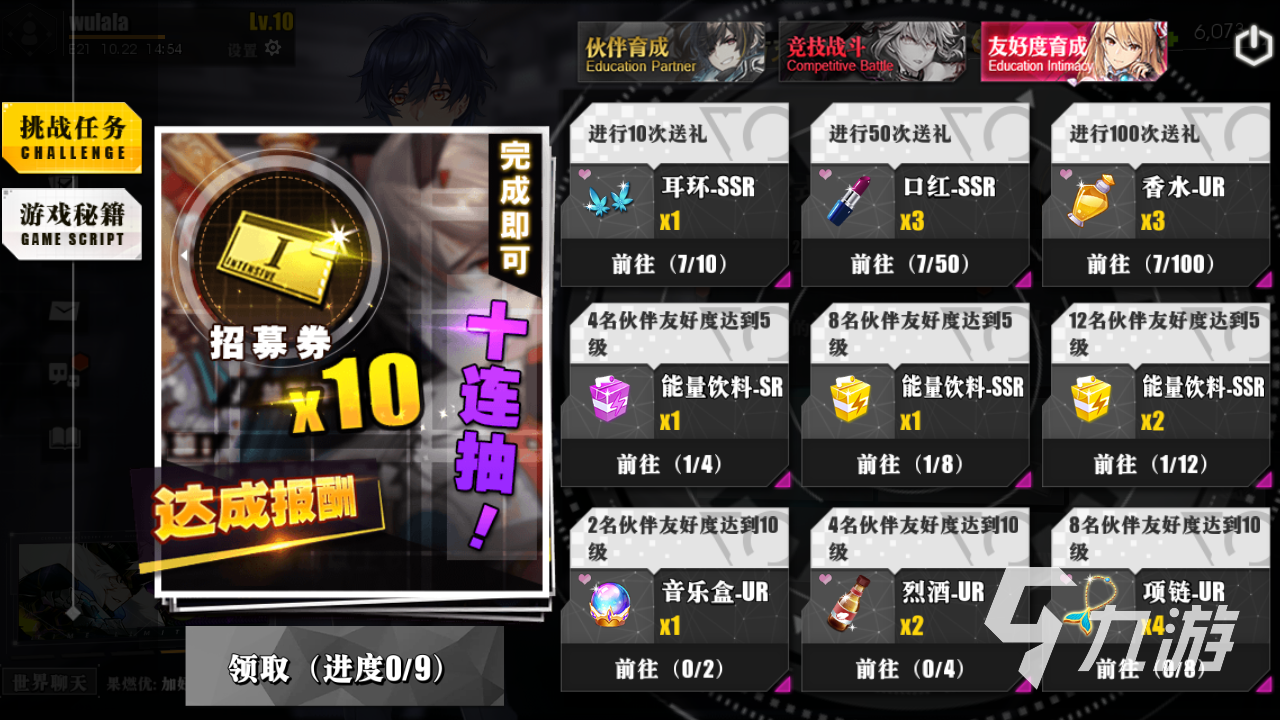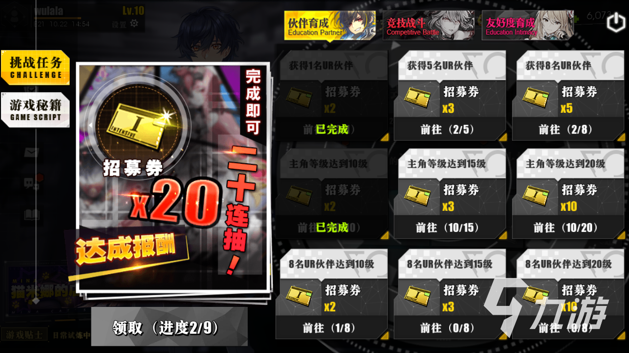 先來看一看伙伴育成,伙伴育成的任務總共有九個。九個任務的haul可以分為獲取、養(yǎng)成以及主角等級。獲取的話就是獲得UR級別的伙伴,這個要通過多次的招募來獲得,在獲得八個UR伙伴之后可以領完獎勵。主角等級很好理解,達到對應等級直接領獎。而養(yǎng)成的話就是提升等級,將八個UR提升到二十級可以獲得獎勵。這個人任務的獎勵是招募券,可以獲得二十張獎勵。
