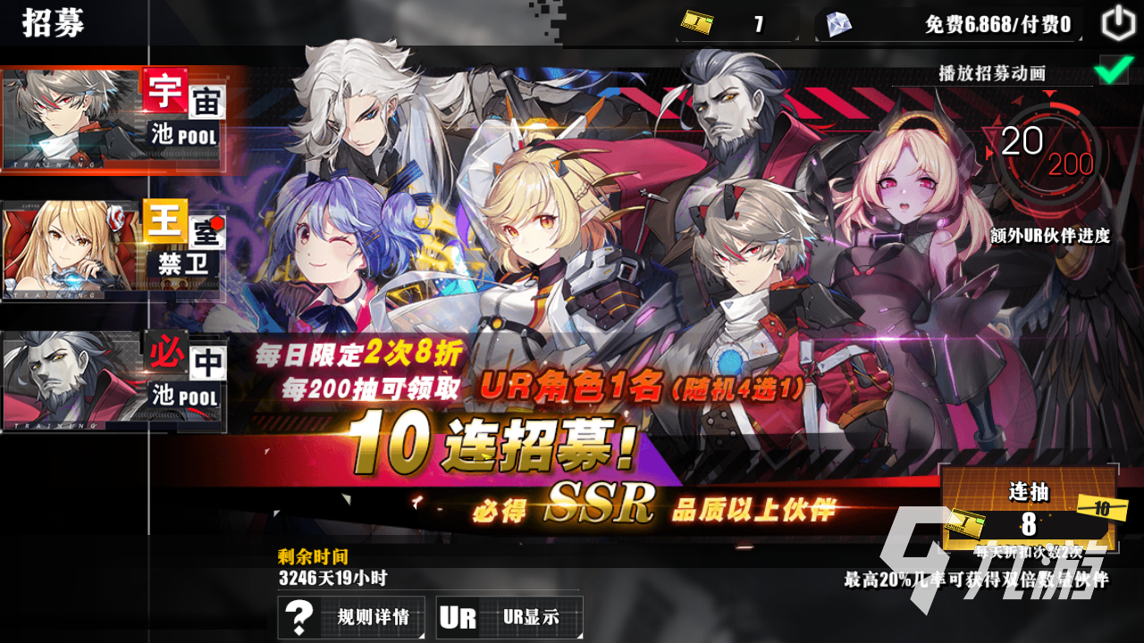 再來就是卡池的介紹,第一個(gè)是宇宙卡池,這個(gè)卡池的話每日的前兩次是八折的,所以說有資源的話建議還是每日保持兩次抽卡,可以節(jié)約不少的鉆石。在抽卡的機(jī)制上,這個(gè)十連抽是可以穩(wěn)定獲得SSR或者以上伙伴的。簡單來說運(yùn)氣不好就是SSR保底,運(yùn)氣好的話就是一些強(qiáng)勢的UR級(jí)別角色了。不過一些SSR伙伴的能力也是不錯(cuò)的,在前中期還是夠用的。