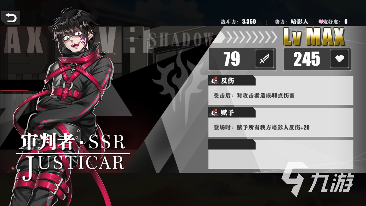 再來(lái)就是SSR的審判者,這個(gè)品級(jí)的話能力會(huì)有一定提升,攻擊力是79點(diǎn),血量245點(diǎn),生存能力提升是比較大的。在技能上也有了很大的改變,第一個(gè)技能石反擊,在受到傷害之后對(duì)攻擊者造成48點(diǎn)傷害。第二個(gè)技能是登場(chǎng)技能,出場(chǎng)的時(shí)候可以賦予暗影人20點(diǎn)的反傷能力。
