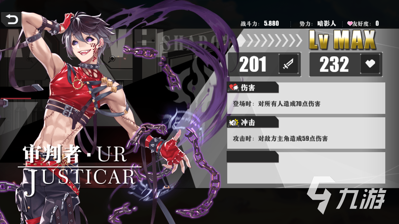 最后就是UR的審判者,這個(gè)級(jí)別的攻擊力是201點(diǎn),血量是232點(diǎn)。從屬性上來(lái)看就是高級(jí)的輸出了。出場(chǎng)技能在登場(chǎng)之后可以對(duì)所有敵人造成70點(diǎn)傷害,這個(gè)能力是非常不錯(cuò)的。被動(dòng)技能“沖擊”在攻擊的時(shí)候可以直接對(duì)敵人主角造成59點(diǎn)的傷害,這個(gè)能力對(duì)于主角是很克制的。
