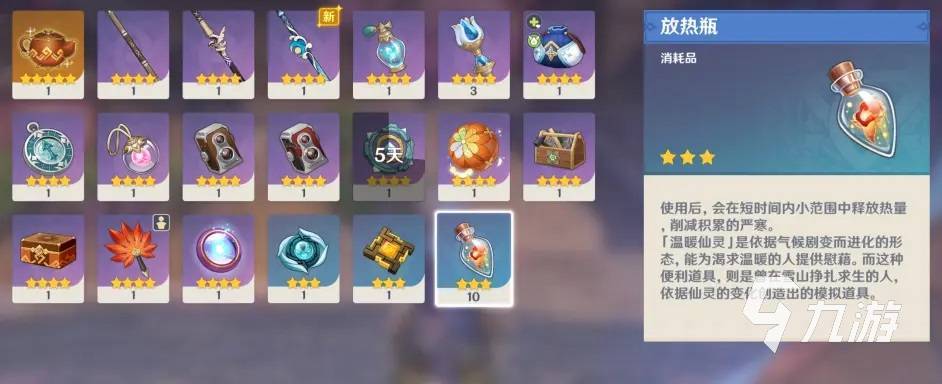 另外放熱瓶比較適合在雪山地區(qū)使用,在使用之后,就可以瞬間清除寒冷值,也就不用擔心會凍僵的問題了。原神中的道具能夠為玩家?guī)肀憷?,所以各位小伙伴可以收集一些以備不時之需。以上就是關于原神3.0有什么小道具的相關內(nèi)容了,小伙伴們可以根據(jù)上面提供的信息,去獲取自己需要的道具。希望這些內(nèi)容能幫助到各位。