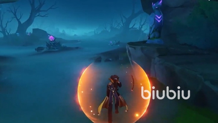 第一處雷鳥的雕像在鶴觀島入口的北邊,也就是在整個(gè)鶴觀區(qū)域的東北處。使用羽毛之后點(diǎn)亮相應(yīng)的雷石就可以獲取寶箱了。