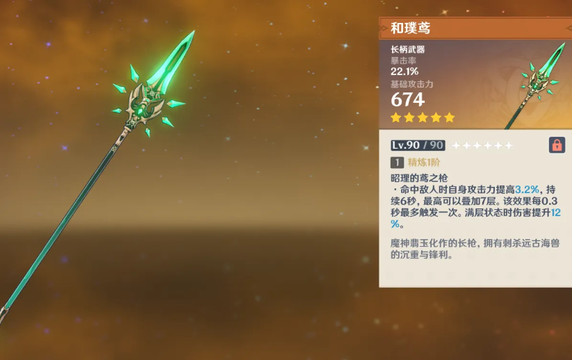 上半段另外一把武器是和璞鳶,為魈的專武,運氣好的話可以在常駐池撈出來。這把武器在老武器里面板比較高,為674并且還有22.1%的暴擊率,外觀和特性和魈高度契合。命中敵人時會提高自身的百分比攻擊力,可疊加七層,持續(xù)6秒。滿層還有額外擁有傷害加成。這個特效決定了需要上場持續(xù)作戰(zhàn)的角色來使用,如果是甩完大招就下場的角色,或者是打一套就切走的主C,那基本上就是一個白板武器,而魈的被動本身也是疊傷害的技能,所以拿這把武器畢業(yè)準(zhǔn)沒錯,當(dāng)然實在不行可以借給雷電將軍玩一玩,畢竟大招完之后也可以多砍幾刀,并需要馬上下場切人。