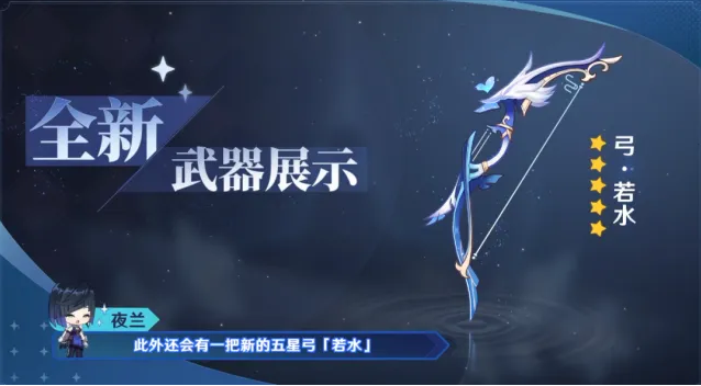 在2.7版本上班會有兩把武器進行up,一把為全新五星弓——若水,另一把為常駐的和璞鳶,是一把弓。前者為夜蘭的五星專武,后者為魈的五星專武,也對應(yīng)了上半up的兩個角色。