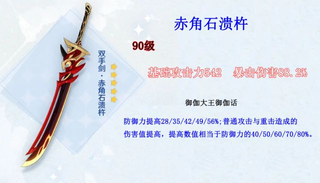下半的自然是荒瀧一斗的專武,赤角石潰杵。這個專武的效果比較簡單暴力,就是提高防御力和普攻和重擊所造成的傷害。這個武器的滿級擁有542攻擊力,雖然比較低,但是有88.2%的暴擊傷害。配合荒瀧一斗突破加暴擊率,非常好用,當(dāng)然如果你沒有荒瀧一斗,此武器可以作為滿命諾艾爾的畢業(yè)武器,諾艾爾同樣是依賴防御力和暴擊傷害的角色,主要輸出方式也是普通攻擊和重擊。