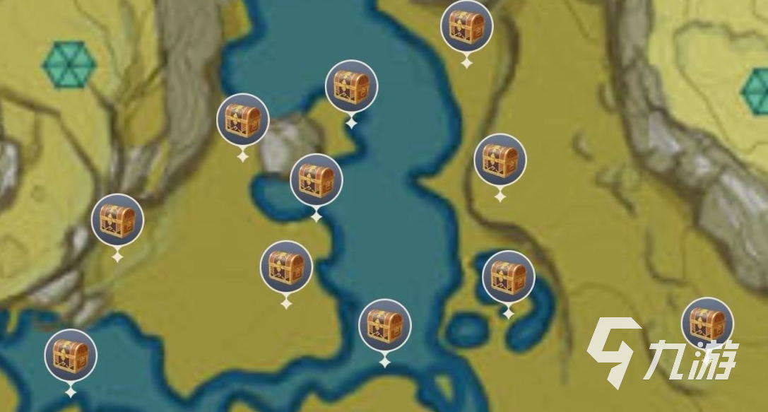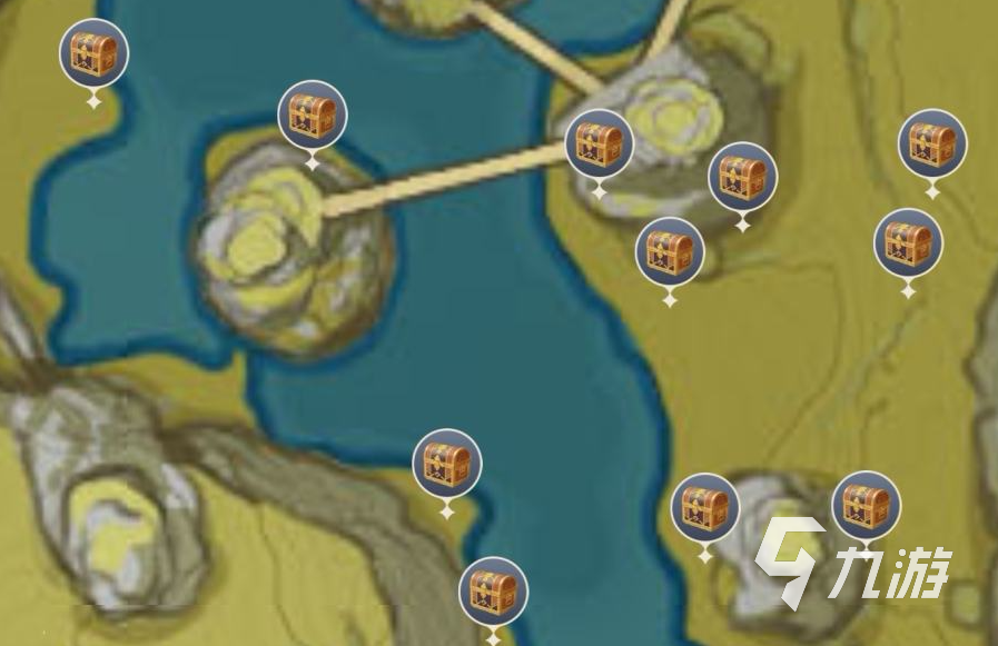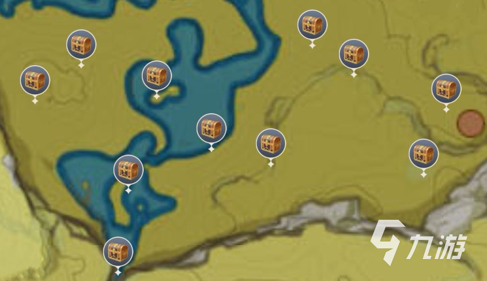點位一向下移動就可以到達點位二,點位二有11個寶箱可以獲取。地圖中央與岸邊相連的島上有一個寶箱,小島的左側(cè)對岸有一個,右側(cè)的岸上則有五個寶箱。此外,地圖下方的左右兩對岸各有兩個寶箱可以開啟。