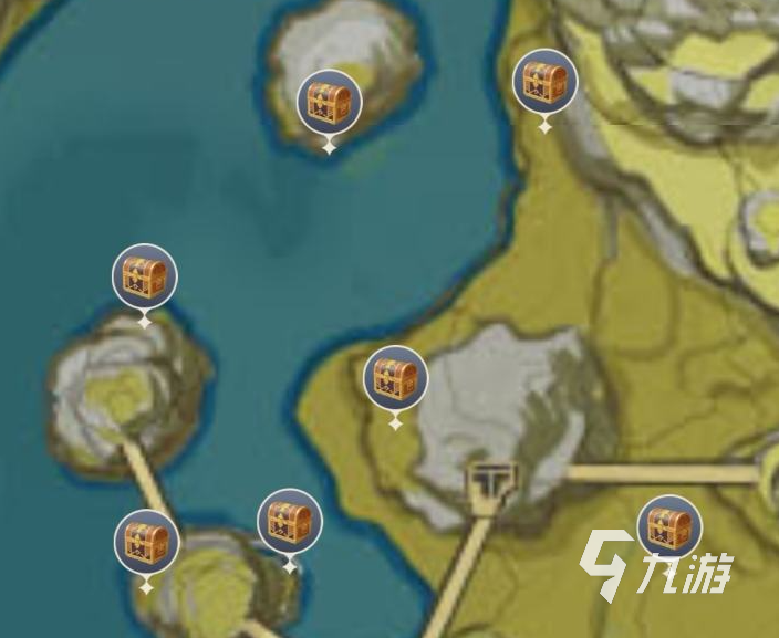 點位四在地圖的最下方區(qū)域,該處也有11個寶箱。左側(cè)的陸地中心位置有2個寶箱,海里的兩座孤島也各有一個寶箱,在最下方的兩島交界處也有一個寶箱。右側(cè)島嶼的寶箱數(shù)量則多大6個,玩家們可以多繞幾圈。