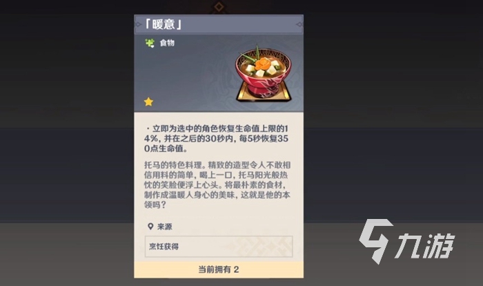 托馬的特殊料理叫做暖意,其正常的料理是味增湯。在2.2版本更新之后大家前往稻妻城志村屋找到志村勘兵衛(wèi)就可以通過消耗1250摩拉購買并且解鎖味增湯的食譜以及制作方法了。制作味增湯是需要1份豆腐以及1份海草。我們可以前往璃月的雜貨店或者是輕策莊豆腐坊進行豆腐的采購。而想要獲取海草的話,我們可以前往稻妻群島采集,當然了,在稻妻城志村屋這里也是可以購買到的。