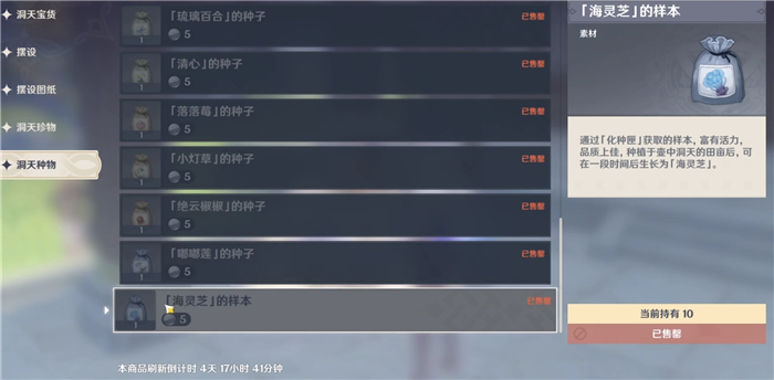 緊接著會出現(xiàn)四個物品,大家只需要選擇頁面中的海靈芝,并進行購買即可,當前限定一次性只能購買5個,每購買一個需要花費1000幣,買5個就是5000幣,該頁面的商品每隔2天就會刷新一次,所以大家可以在2天之后,再按照上述步驟去購買海靈芝。