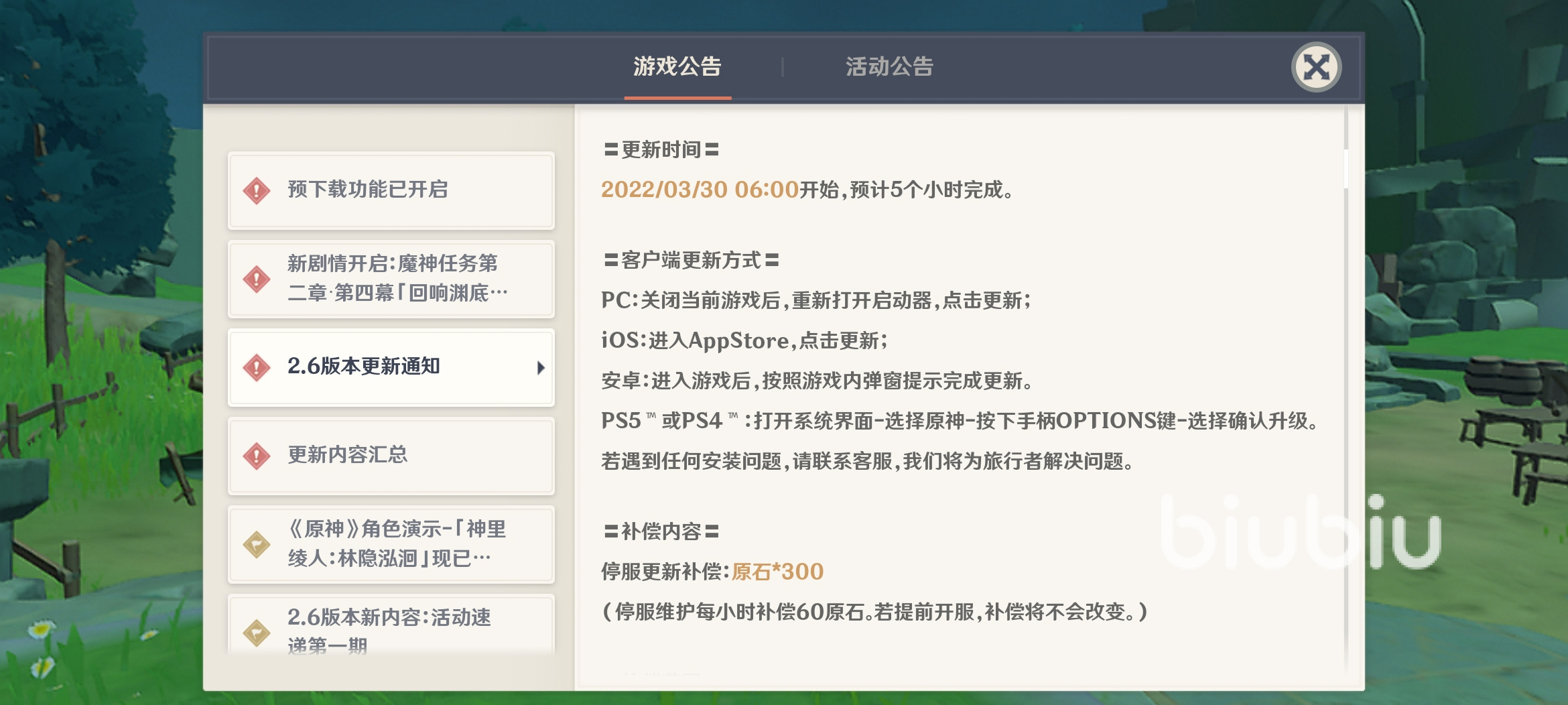 原神2.6版本更新的內(nèi)容比較多,目前已經(jīng)開放了預(yù)下載,玩家們可以通過游戲短或者登陸界面提前下載好所需的更新包,這樣會節(jié)省一些節(jié)省一些時間。由于更新內(nèi)容比較大,這次采用了停服更新,從3月30日上午6點(diǎn)開始,預(yù)計更新時間為5小時,等更新完成之后,玩家重新登陸原神即可。