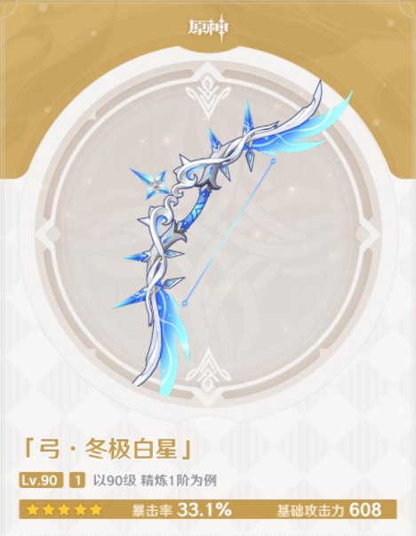 冬極白星是即將再2.2版本更新中推出的一款五星限定弓類武器,其一級的基礎攻擊力為746點,升級到90級精煉1階之后的暴擊率為33.1%,基礎攻擊力為608點,單從屬性面板上看還是非常不錯的。