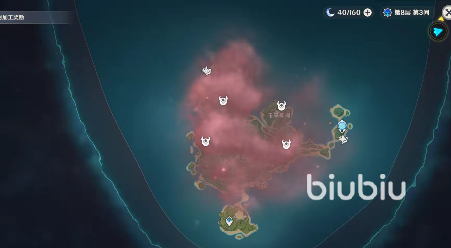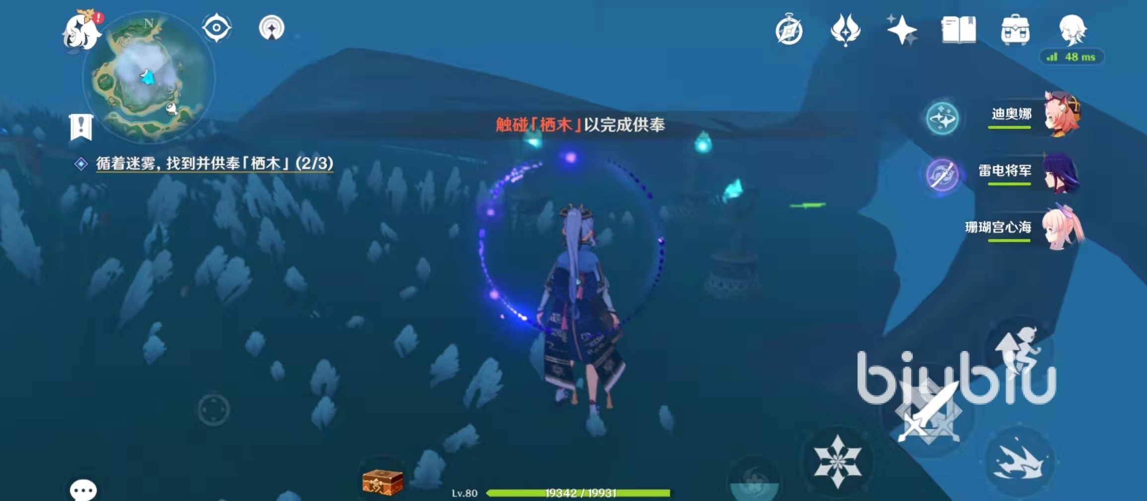 雖然第一天迷霧解除了,但各位旅行者別高興太早了,等玩家第二天再進入游戲時鶴觀島再次布滿迷霧,類似的任務又多了一個,操作步驟和之前類似,區(qū)別在供奉棲木的玩法,玩家需要通過元素痕跡找到紫色的團,將其擊碎。完成三處位置后再次迷霧消散。