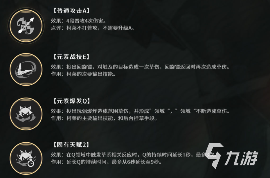柯萊的固有天賦是在Q領(lǐng)域中,觸發(fā)草系相關(guān)反應(yīng)的時(shí)候,Q的持續(xù)時(shí)間會(huì)延長(zhǎng)一秒,最多可以延長(zhǎng)三次。