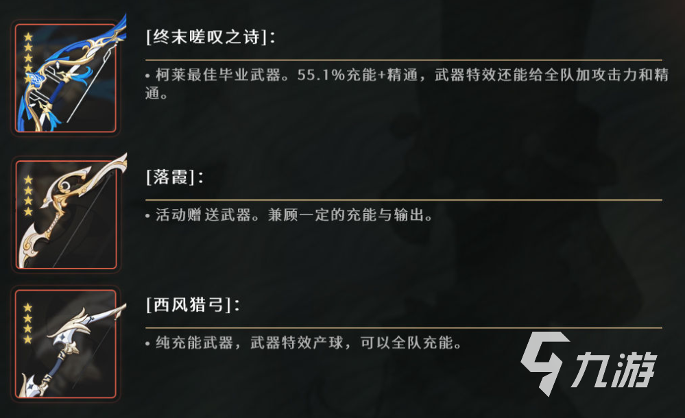 柯萊的武器建議玩家使用終末嗟嘆之詩(shī)。他能夠添加百分之五十五點(diǎn)一的充能和精通,這個(gè)武器的特效還可以為全隊(duì)增加攻擊力和精通。