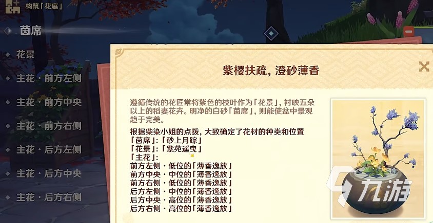 茵席的位置挑選第二行第一位,花景的位置挑選第一行第三位。鮮花正前方的左邊挑選第四行第二位。鮮花正前方的中間挑選第四行第一位。鮮花正前方的右邊挑選第四行第二位。鮮花正后方的左邊挑選第四行第一位。鮮花正后方的中間挑選第四行第一位。鮮花正后方的右邊挑選第四行第三位。