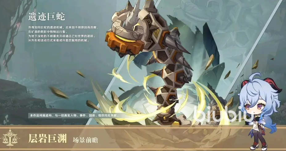 在2.5版本的消息中,原神官方已經(jīng)明確的層巖巨淵的新BOSS叫“遺跡巨蛇”,長得像是很多巖石組合在一起的蛇,而同時放出的遺跡巨蛇的設(shè)定圖里我們看到,這條蛇的每個部件其實都是機械做的,所以實際上它是由機械部件組成的蛇形狀的機器人BOSS。