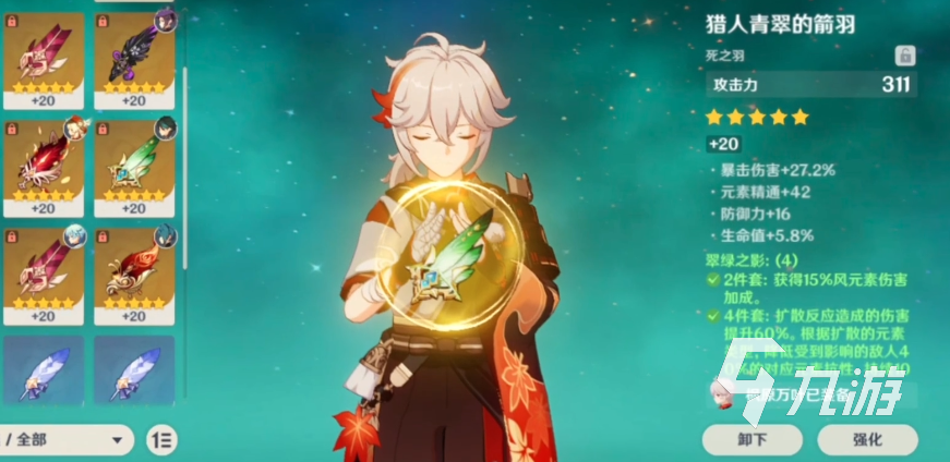 其次渡過前期以后,尤其是在大家進(jìn)入到后期以后,小編推薦大家選擇翠綠獵人四件套,這套是有著比較高貴的40%減抗加成效果的,非常的適合主要用來打副核心位的萬葉。