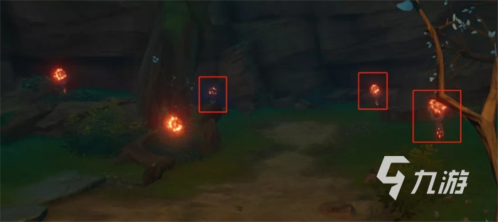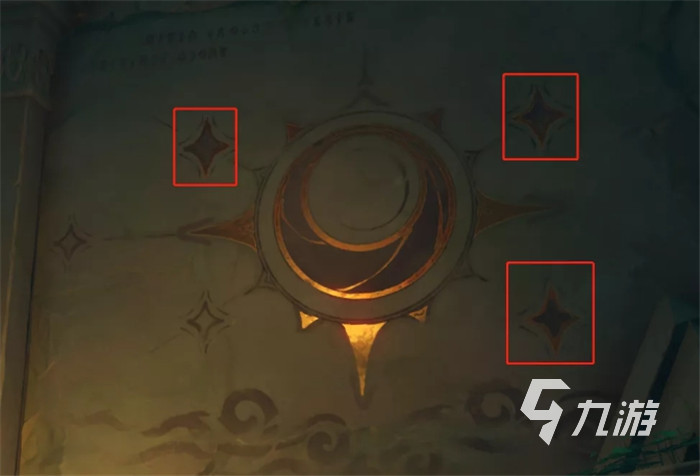 第六幅、位于遺跡火把解謎墻的側(cè)面。此處壁畫上面也是有菱形圖案,還是根據(jù)有陰影的團(tuán)順序點(diǎn)亮火把也可以拿到一個(gè)寶箱。