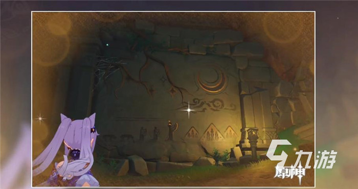 第一幅、在遺跡中有個(gè)雷鳥圖案的墻壁,這需要使用道具奇特的羽毛,才能將其打開,進(jìn)去之后右轉(zhuǎn)抬頭就可以看到了。