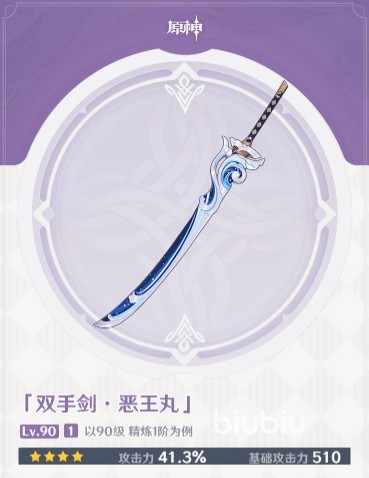 惡王丸是即將在原神2.2版本推出的限定四星雙手劍武器,其一級的初始攻擊力為9點,等級到90級精煉一階的攻擊力為41.3%,基礎(chǔ)攻擊力為510點。惡王丸是傳說中惡王的愛刀,其刀身龐大又雄偉,但是在揮舞起來會覺得意外的輕便。