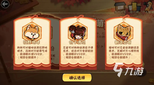 變換時間結(jié)束后,會公布雙方的戰(zhàn)線分布情況,在這個時候大家就需要給每條戰(zhàn)線選擇一個萌物,萌物之間有著相應的克制關(guān)系,分別是狗克貓,貓克忍者,忍者克狗,當己方為狗狗時,分數(shù)會歸零并奪取對方分數(shù),若敵方時忍者奪取會失敗,當己方是貓時,對方只要不是狗狗就能獲得翻倍的分數(shù),當己方是忍者時,可以保護分數(shù)不被奪取。
