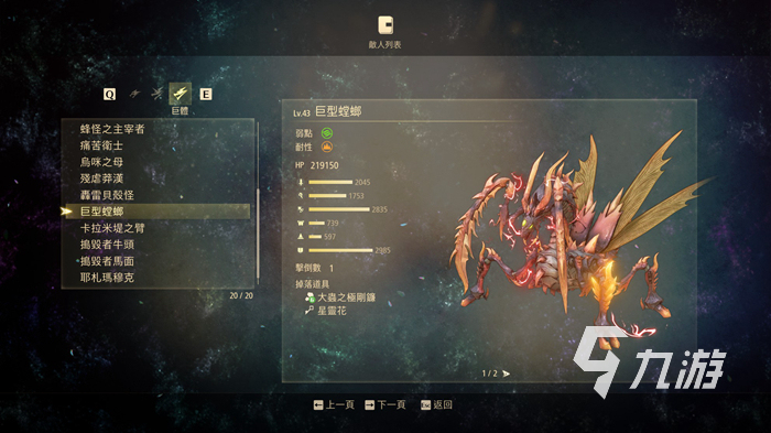 首先我們來看一下巨型螳螂的基本屬性。巨型螳螂是徘徊在桑狄尼斯溪谷的巨體怪物,其擁有傲人的龐大身軀以及能力,巨型螳螂的鐮刀據(jù)說可以輕易劈開一切并且巨型螳螂還擁有釋放沖擊波這種遠(yuǎn)程攻擊手段。巨型螳螂的等級(jí)為43級(jí),其生命值為219150點(diǎn)、攻擊力為2045點(diǎn)、屬性攻擊力為1753點(diǎn)、貫穿力為2835點(diǎn)、防御力為739點(diǎn)、屬性防御力為597點(diǎn)、耐久力為2985點(diǎn)。