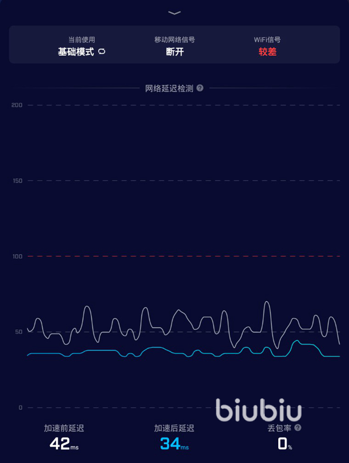 我們能夠看到,在WiFi信號(hào)較差的情況下,biubiu加速器也能夠提升游戲連接的穩(wěn)定性并且減少游戲連接的延遲情況。而平臺(tái)提供了兩套加速模式,智能模式下可以幫助我們?cè)赪iFi信號(hào)差的情況下自動(dòng)選用移動(dòng)數(shù)據(jù)作為加速服務(wù)的網(wǎng)絡(luò)支撐,大大提升了加速的效果。
