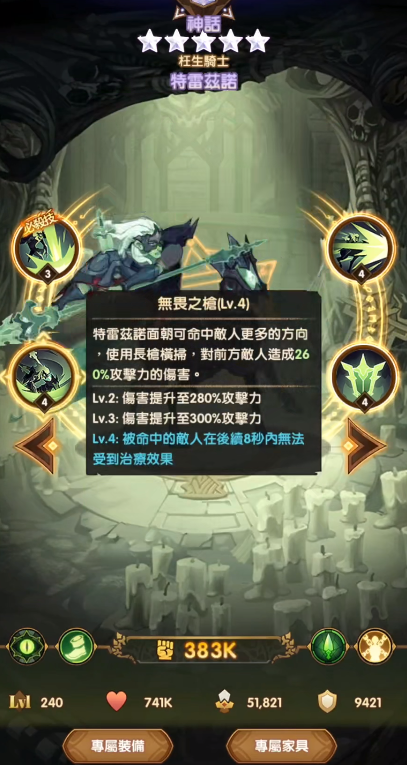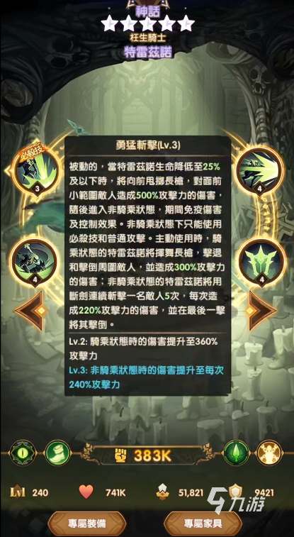 勇斬猛擊:這是一個被動技能,在特雷茲諾的生命減低到一定程度的時候,能夠把手中的長槍扔向前方,造成一定的范圍傷害,并且能夠免疫傷害和控制,不過大家只能去使用必殺技和普通技能,這個技能怎么說呢,也是一個變相的保命技能了,還是比較不錯的,能夠避免自身突然被秒掉帶來的風(fēng)險,如果是主動使用的話,主要就是用來擊退敵人,這對于被圍困的情況下,可以使用出來進(jìn)行清場,不要指望用這個技能打傷害,傷害還是比較有限的。
