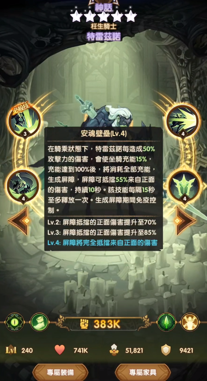 安魂壁壘:在騎乘狀態(tài)下的時候,特雷茲諾每次對目標(biāo)造成傷害的時候,都能夠使自身的坐騎進(jìn)行充能,當(dāng)充能達(dá)到100%的時候,會消耗掉自身全部的充能,進(jìn)而生成一個屏障,這個屏障能夠抵擋絕大部分來自敵方正面的攻擊傷害,這個效果還能夠持續(xù)數(shù)秒的時候,并且在施放生成屏障的期間是免疫控制的哦,雖然不是一個傷害技能,但是對于躲避傷害,和發(fā)起攻擊和敵人耗血來說,這個技能是非常強(qiáng)力的。