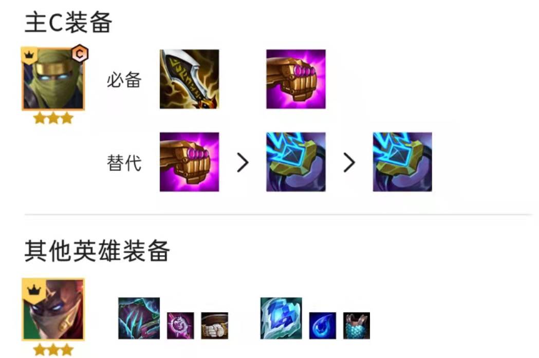 這套陣容劫能吃到潛行者個(gè)忍者的羈絆,所以算是這套陣容單核主C。無盡+法爆的爆殺流出裝傷害非常爆炸,且劫自帶跳后和AOE的機(jī)制,可以瞬間秒殺對(duì)手脆皮。第三件作出離子火花,既能對(duì)敵人造成震擊,還能提升自己的技能的傷害,收益非常高,當(dāng)然追求絕對(duì)傷害的玩家第三件可以繼續(xù)做法爆。派克出鬼書和冰心算是打特效,給對(duì)手施加減攻速和重傷的DEBUFF。陣容對(duì)遇到鐵桶站位的對(duì)手,一定要學(xué)會(huì)沉底站位,把對(duì)手拉出來方便劫切入后排。派克的話放底角,可以暈住更多的人。