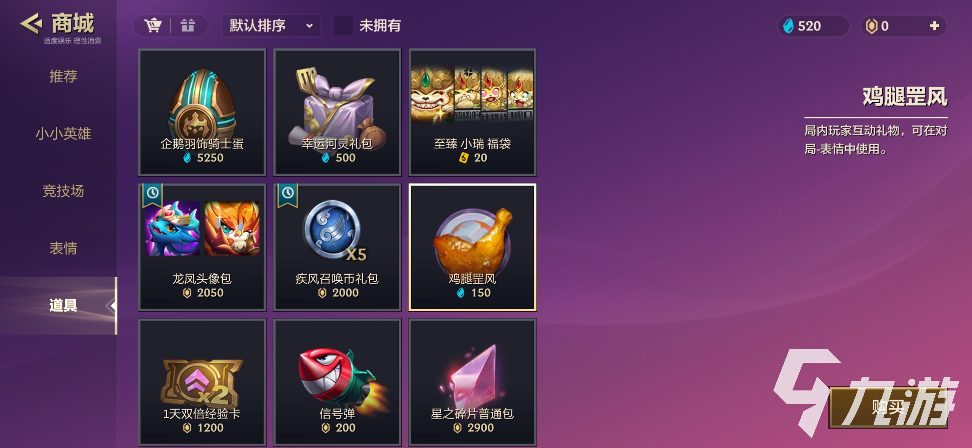 而還有一種就是購買表情以及道具,在游戲中比如說贏了一場玩家就可以進行嘲諷,這個時候發(fā)送這些嘲諷人的表情,會很搞人的心態(tài),比如雞腿罡風(fēng)需要消費150個藍寶石進行購買,其他的好看一點的道具以及表情都需要消耗點券了,總結(jié)一句話,藍色寶石沒什么用。這款游戲它的氪金點并不是很多,閑著沒事兒,將這些藍色寶石購買一些道具,還是挺劃算的,氪金就真的沒必要了。